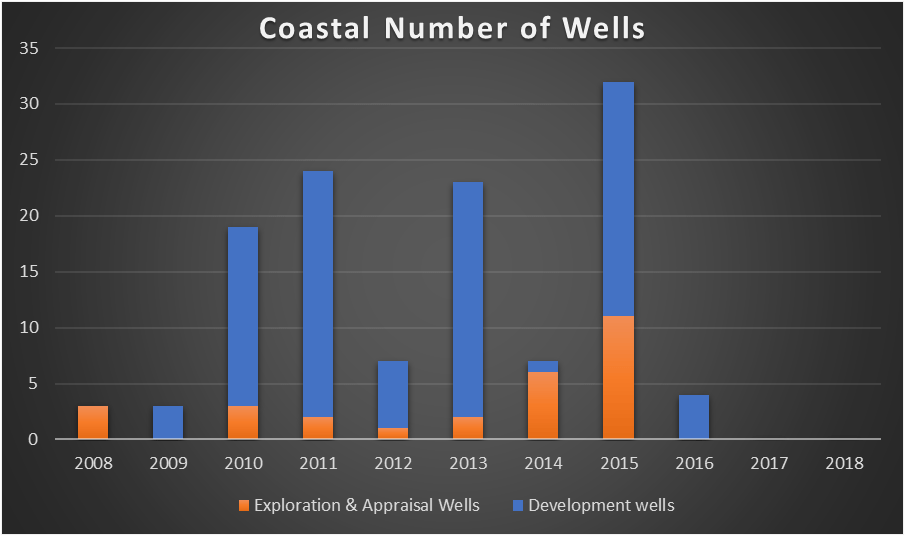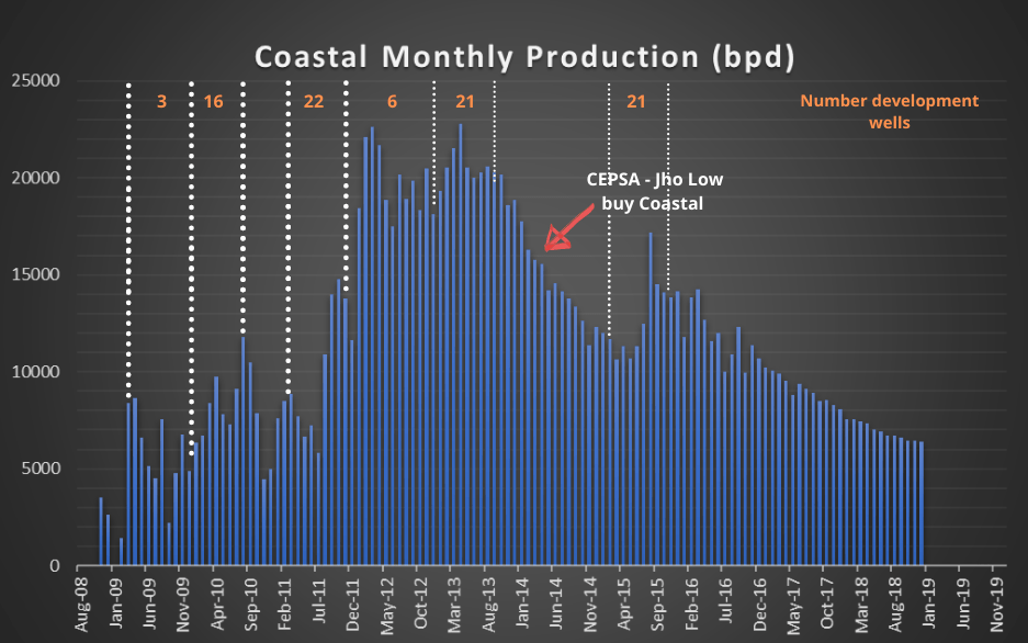 In 2015 after having declared 17 MMbbl of proved reserves Coastal, now under full CEPSA ownership, embarked in a campaign of exploration and appraisal drilling 11 exploration and appraisal wells and 21 production wells. The production increased briefly for a few months from 12,000 bpd by the end of 2014 to around 15,000 bpd by the end of 2015 only to resume the previous rapid decline in full force. By the end of 2015, Coastal declared only 7.5 million barrels of proved reserves to the Thai DMF and would only drill 6 additional wells in the concession before decommissioning in April 2019.