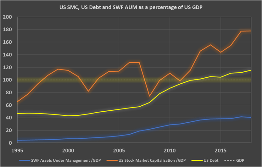 Using public data one can observe that in the 10 years between 1995 and 2005 the total SWFs assets under management (AUM) increased from 5% to 10% of the US GDP. In the next 10 years, between 2005 and 2015, the SWFs AUM increased even more dramatically, from 10% to 40% of the US GDP, reaching an astounding $8 trillion US dollars by 2019 according to the best estimates by the Sovereign Wealth Fund Institute [1-2].