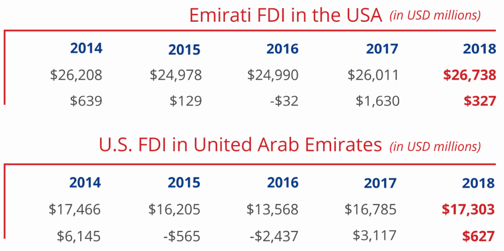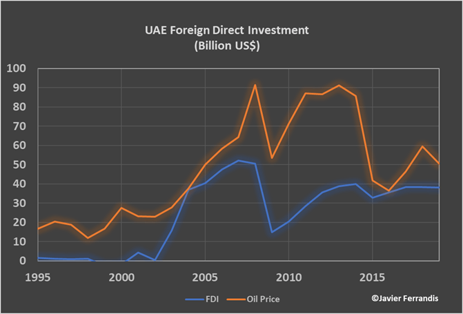 The UAE began to play a role in global Foreign Direct Investment after the year 2000 when the price of crude oil surpassed $20 dollars/barrel. According the US Bureau of Economic Analysis (BEA) it reached a maximum of $52 billion in 2007 and was $38 billion in 2017 and 2018. The total UAE FDI outflow since 1995 adjusting for inflation is by my calculations $715 billion in 2019 US dollars. According to the Bureau of Economic Analysis, the Sovereign Wealth Fund Institute, the Sovereign Wealth Lab (SWFL) and other SWF monitoring organizations the US market is the preferred target for direct SWF investments [3]. The SWFL estimates that the amount of sovereign wealth directly invested in the US is around 1/3 of the total amount or 3 trillion US dollars, which represents around 15% of the US GDP. According to the BEA the emirati FDI in the USA between 2014 and 2018 averaged 70% of the total emirati FDI. If we extrapolate this we estimate that the accumulated UAE FDI in the USA is around US $500 billion, which agrees with the SWFI estimates. If we include the amount of SWF wealth that is invested outside of the US market but that is managed by US private equity firms and other US based investment vehicles the amount is higher than $500 billion. Since the total FDI in the USA was $4.34 trillion by 2018 according to a July 2019 report by the Bureau of Economic Analysis the UAE contribution to the total FDI in the USA is around 12% . It is estimated that each trillion of FDI supports the creation of 1.5 to 2.0 million jobs in the USA. Therefore the accumulated UAE FDI in the USA supports around 850,000 jobs in the USA.
