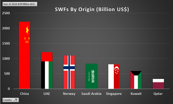 Even though by 2019 there were nearly 100 active sovereign wealth funds (SWFs) in the world 90% of the current SWF wealth originated in just a few countries: China (27%), Norway (14%), Singapore (10%) and the GCC states (37%) : Saudi Arabia, United Arab Emirates (UAE), Kuwait and Qatar.