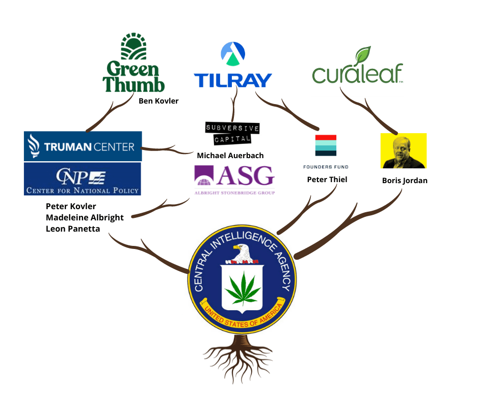 In the last 4 years, the newly formed legal cannabis industry has emerged from $2 billion to become a $35 billion industry by market cap. Several new American companies have come to dominate the market. We will show in this article that three of the major US cannabis brands include at their helm people like: the son of a wealthy heir, a megadonor, and a philanthropist who replaced the ex-CIA director as head of the Truman Center for National Policy (TCNP), a fellow of the TCNP and the CFR (Council of Foreign Relations), and Vicepresident of a well-known investment and advisory firm founded by an ex-Secretary of State, a CIA agent and liaison with the Russian government in the 1990s (and also CFR fellow) who advised the Russian government and participated actively in the transition of Russia to a free market economy and last but not least CIA’s golden boy, Peter Thiel. You be the judge.