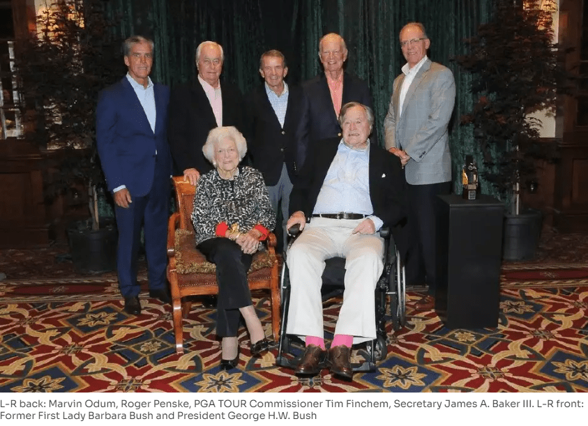 Here we see the CEO of Shell, Marvin Odum, on the left, and Shell’s VP of Shell Human Resources at the time, Bruce Culpepper, honoring G.H.W. Bush in March 2016 [42]. Bruce Culpepper succeeded Marvin Odum as Shell’s CEO the next month, April 2016. Let us not forget that the M.D. Anderson Cancer Center and Rice University in Houston were built on the Baker’s state, i.e. land that originally belonged to the family of the Secretary of the State under G.H.W. Bush, James Baker III [43], who can be seen in the picture next to Bruce Culpepper. The close relationship between Marvin Odum’s family, James Baker III, and George H.W. Bush goes back decades. Marvin Odum’s father was an avid golfer, too.
