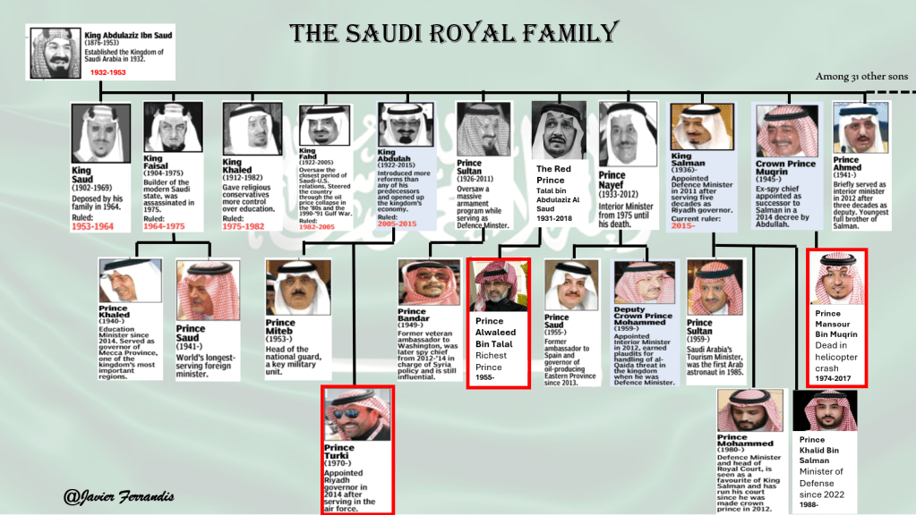 Other younger grandsons of King Saud were significant figures in Saudi Arabian politics at that time. Prince Turki bin Abdullah Al Saud stood out, particularly as the Governor of Riyadh. Another grandson, Prince Al-Waleed bin Talal, was not viewed as a potential candidate for Crown Prince due to his minimal involvement in state affairs. Prince Al-Waleed bin Talal gained international recognition as the wealthiest of all Saudi princes because of his business success.
