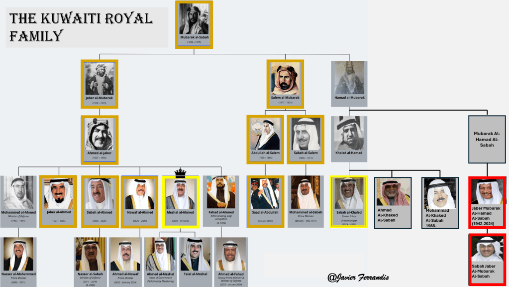 Since the death of Kuwait’s first emir, Mubarak Al-Sabah, in 1915, the country has been ruled by emirs who are descendants of two of his sons: Jaber Al-Mubarak and Salem Al-Mubarak. Although all branches of the family must agree on the election of a new emir, the descendants of Mubarak’s third son, Hamad Al-Mubarak, have not produced any emir since the establishment of modern Kuwait. The Al-Hamad branch and the Al-Jarrah branch (not included in this discussion) have produced sheiks who have held significant government positions, such as Prime Ministers and Ministers of Defense. The harmonious alternation between the Jaber and Salem branches of the ruling family stood until 2006, when Saad Al-Abdullah ruled Kuwait for nine days and was voted out of office by the Parliament due to health concerns. This led to the coronation of Sabah Al-Ahmed and narrowed the rule further within the Jaber branch. Sabah Al-Ahmed was considered the last strong ruler in the House of Sabah. He appointed his half-brother Nawaf al-Ahmed as his crown Prince. Following the death of Sabah al-Ahmed in 2020, according to Kuwaiti law, the new emir, Nawaf Al-Ahmed, had a one-year period to select his crown prince. There were several promising candidates for the crown prince, including former Prime Minister Nasser Al-Mohammed al Sabah (son of Emir Sabah Al-Ahmed), Prime Minister Jaber Al-Mubarak Al-Sabah, or Deputy Prime Minister Nasser Sabah Al-Ahmad Al-Sabah.
